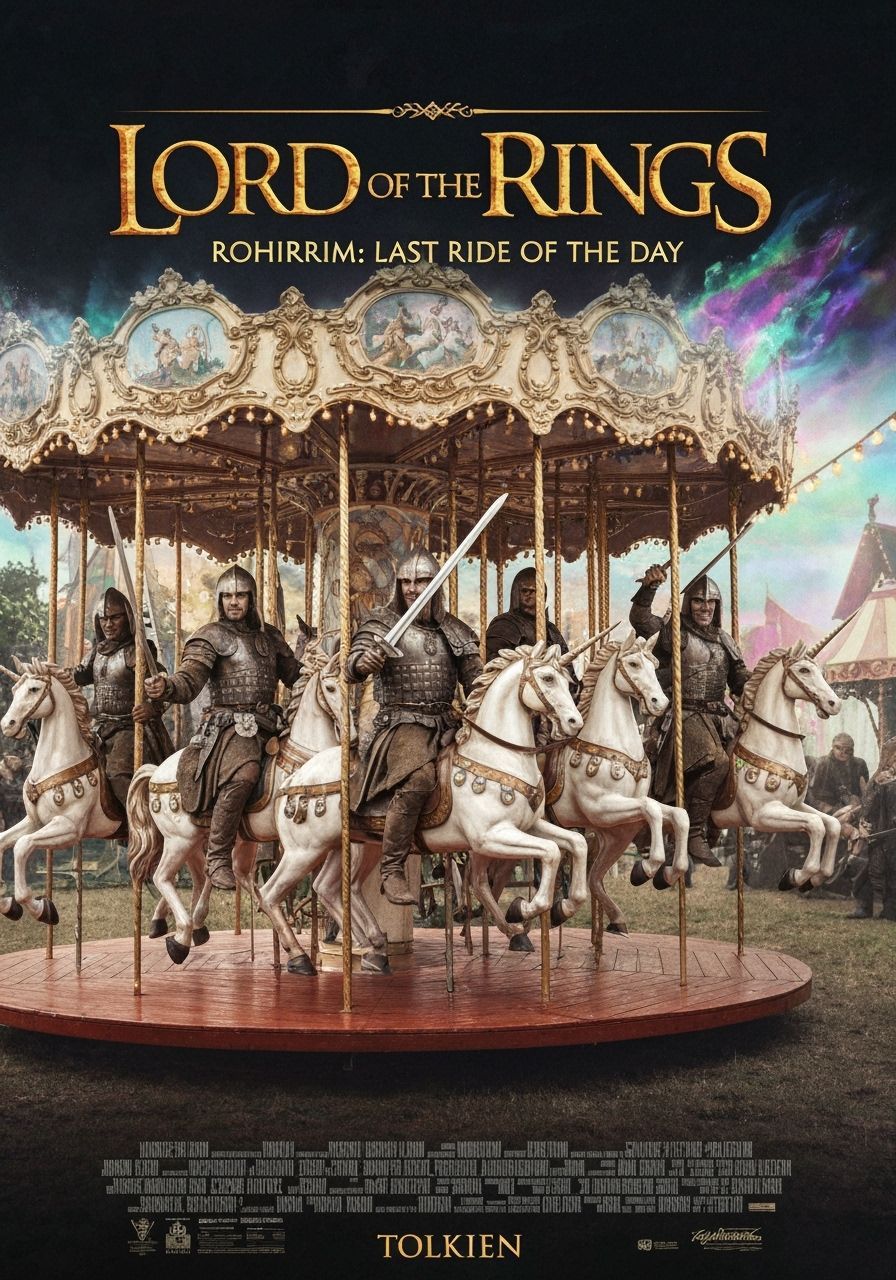 A movie poster parody for Lord of the Rings, featuring Rohirrim warriors on a carousel with unicorns and horses. Blends dark fantasy with whimsical, vibrant colors.