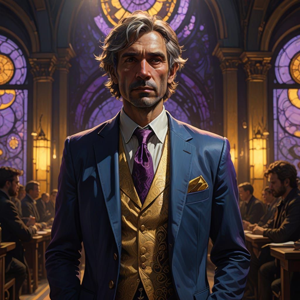 This image shows a middle-aged man at a graduation ceremony. He wears a blue blazer, khaki pants, and a white shirt, his face lit by golden light and his clothes draped in shadow, rendered as vivid digital art.