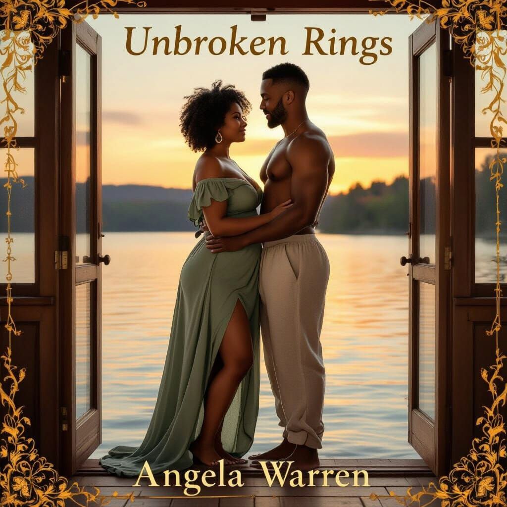 This image shows a romantic book cover featuring a brown-skinned woman and man embracing at twilight. The artwork evokes art nouveau with golden textures and dreamy hues, reminiscent of 18th-century romanticism.
