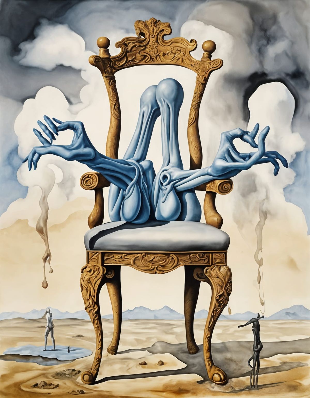 This striking watercolor painting features a surreal chair composed of human legs and arms, blending the boundaries between reality and fantasy in a dreamlike aesthetic reminiscent of the likes of Magritte and Dali.