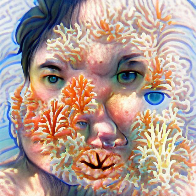 This image depicts a serene ocean scene with vibrant coral formations. It features a self-portrait subtly integrated within the coral reef, rendered with photorealistic detail.