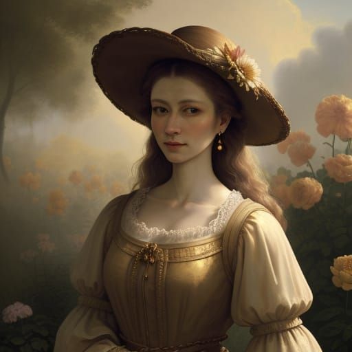 This image shows a woman walking through a garden bathed in golden light, rendered with soft brushstrokes. The artwork evokes a baroque aesthetic with warm colors and gentle cloud textures.