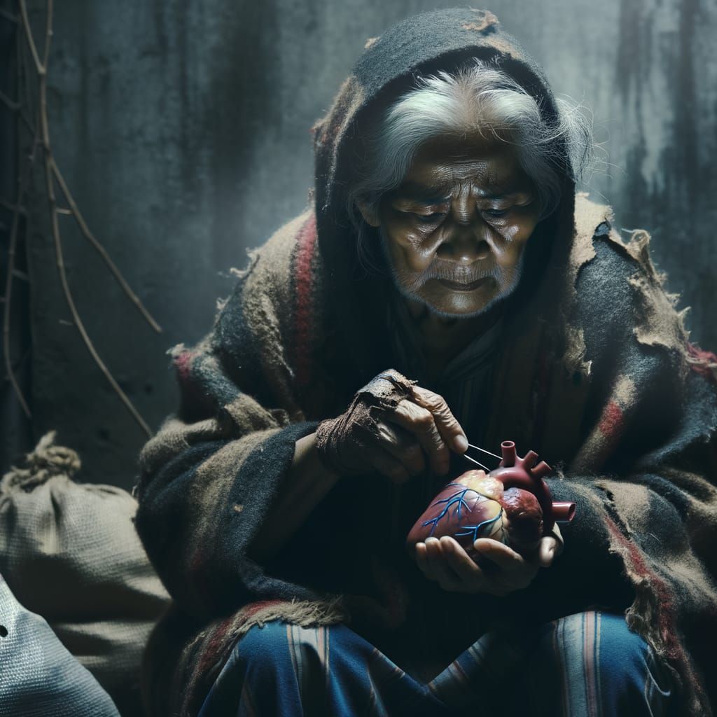 This image shows a poignant scene of an elderly Hispanic woman repairing a heart with deep scars, set in a dark and shadowy environment, highlighting her resilience and compassion despite her own hardships.