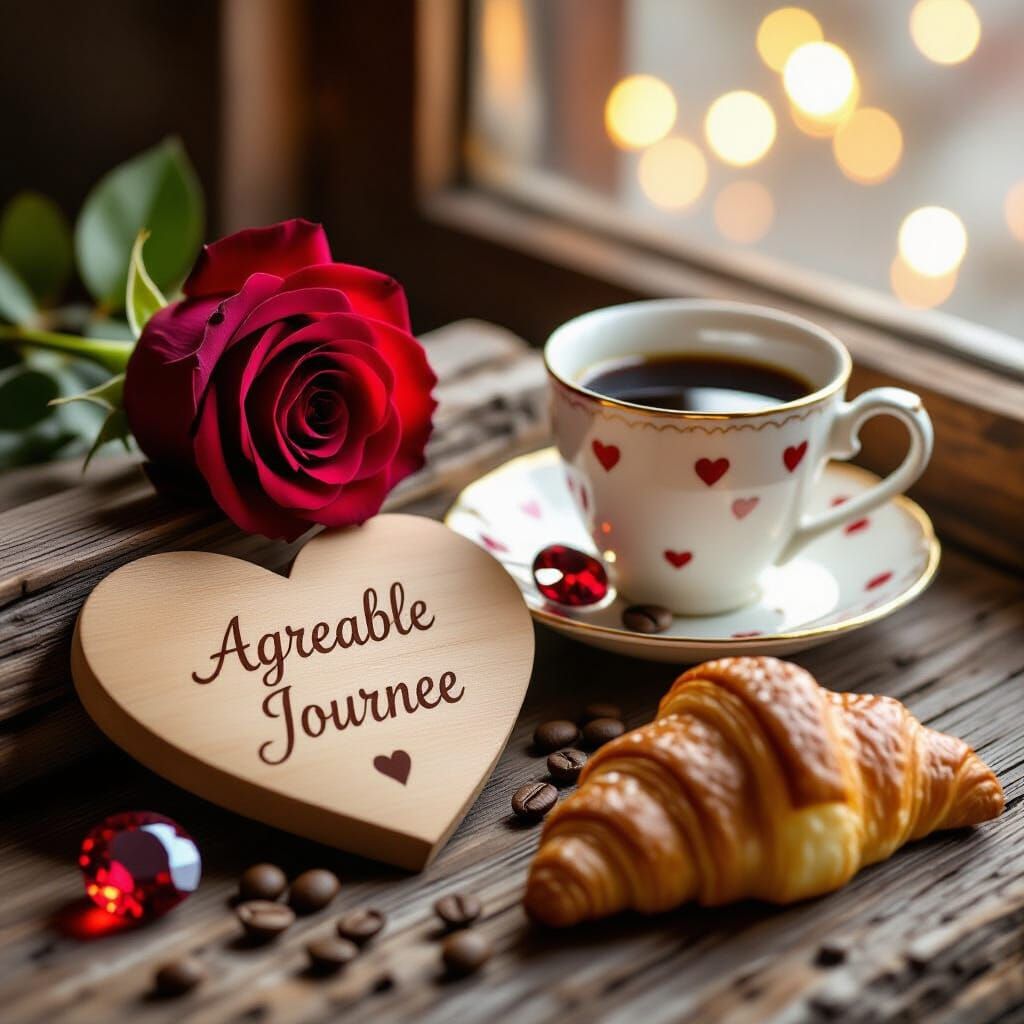 This photorealistic image captures a deep crimson rose, ruby heart, and espresso on wooden planks. Soft evening light creates a dreamy, romantic atmosphere with cinematic detail.