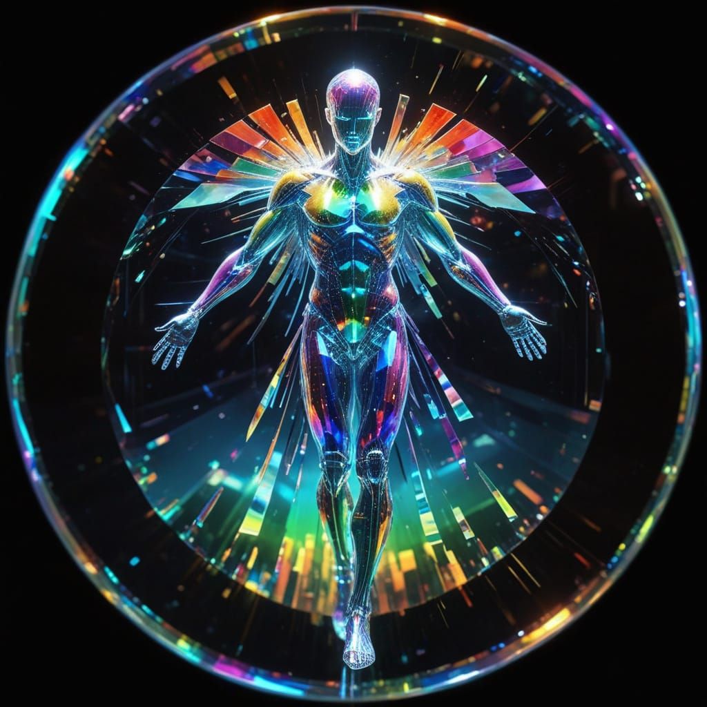 This image shows a crystalline humanoid figure refracting light and emitting rainbow arcs. Scientific transparencies and a glitchcore aesthetic create a vibrant display of fractured rainbows.
