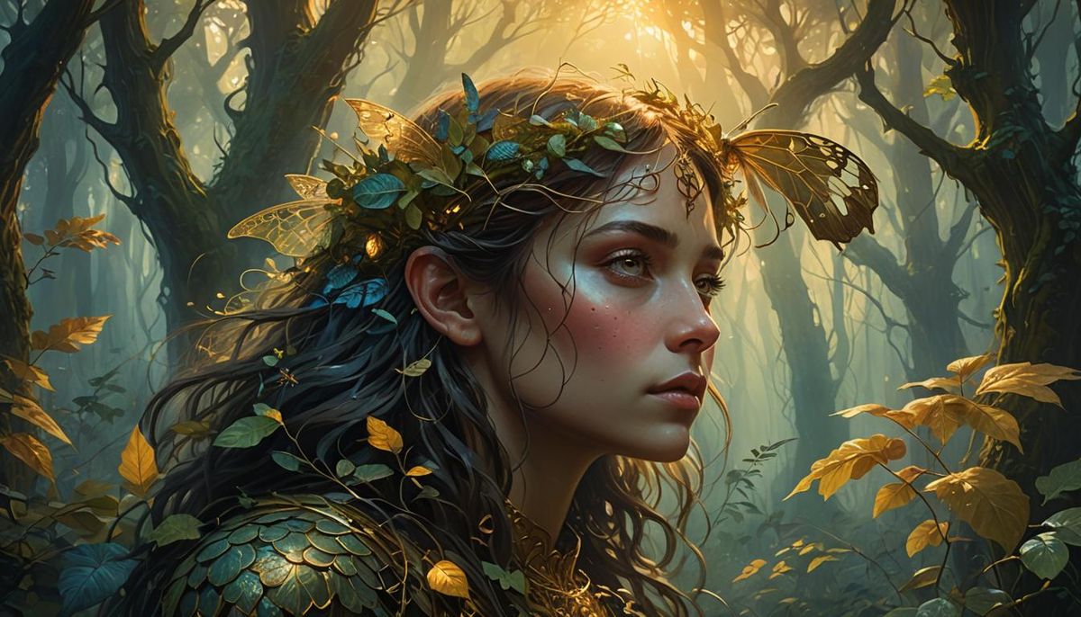 A close-up of a beautiful girl gazing lovingly from a mystical forest. This fantasy art features soft oil painting techniques, golden light, intricate architecture, and glowing creatures in an art nouveau aesthetic.