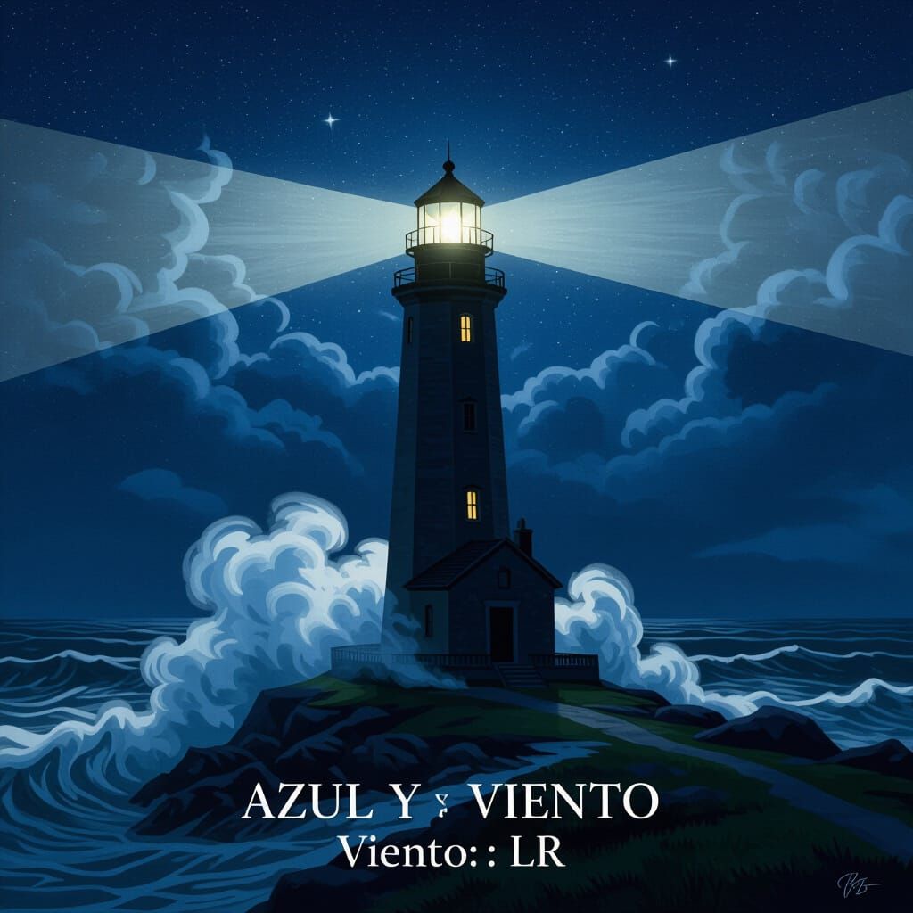 Un faro solitario se alza majestuoso contra un cielo nocturno turbulento y estrellado. El haz de luz atraviesa la oscuridad, iluminando la bruma que se arremolina a su alrededor.