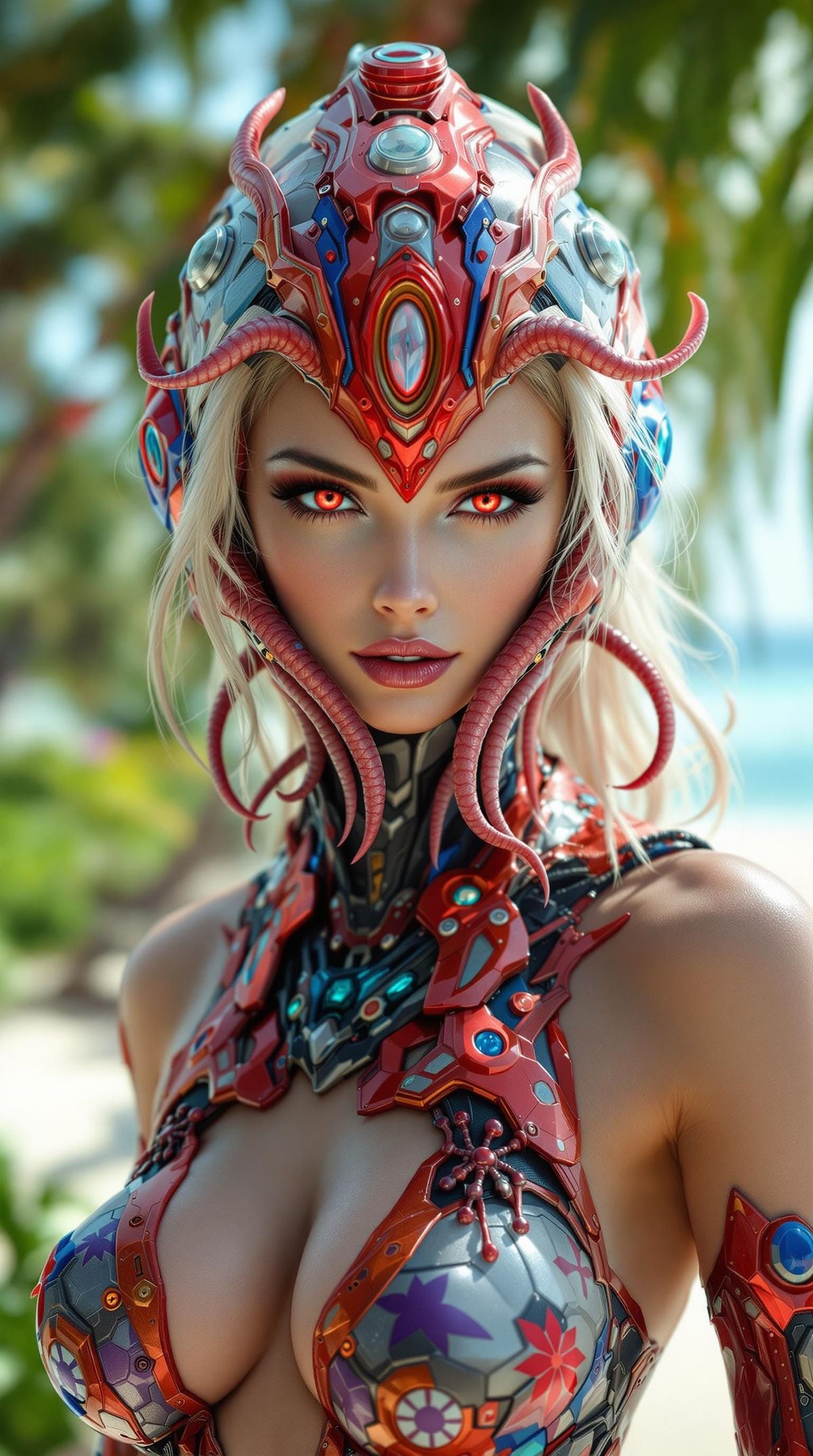 This image shows an alien woman with platinum blonde hair and red eyes wearing futuristic armor. She stands confidently on a tropical beach with bokeh effects in a cinematic digital art style.