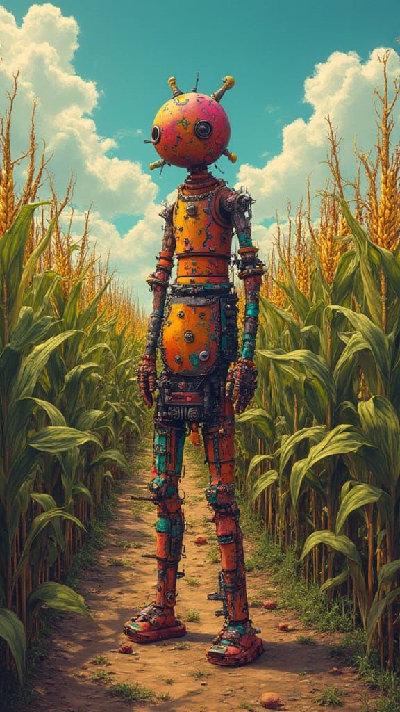 A vibrant cornfield featuring a scythe, rendered with contrasting colors and industrial accents. This image blends hyperdetailed landscapes with Bauhaus and steampunk aesthetics.