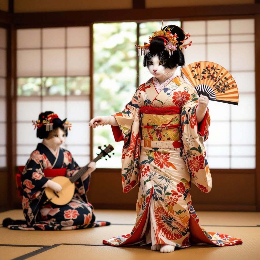 This image shows a tri-colored cat-geisha performing a traditional Japanese fan dance in a tea room. The feline dancer moves gracefully to shamisen music played by another kimono-clad cat, enhanced by a burst of orange.