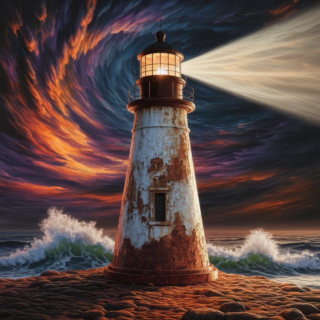 A striking picture of a lighthouse standing firm against a stormy sea. The lighthouse is highly detailed with chipped paint and rust, in an oil painting style with dramatic lighting.