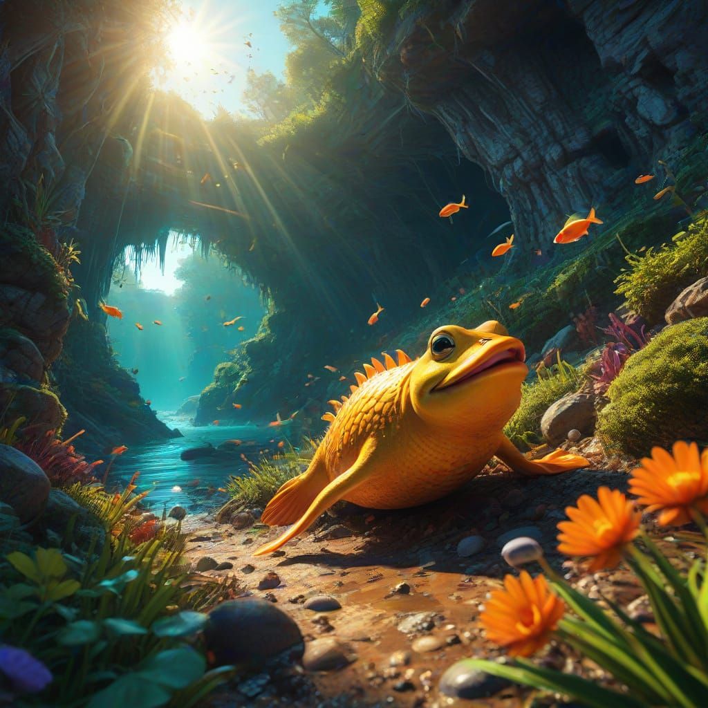 This image shows a thrilling underwater battle between a giant sea monster and a group of determined ducklings, frogs, and bunnies in a vibrant, detailed, and whimsical forest scene, inspired by Pixar and Disney's signature style, with bold brushstrokes and bright colors.