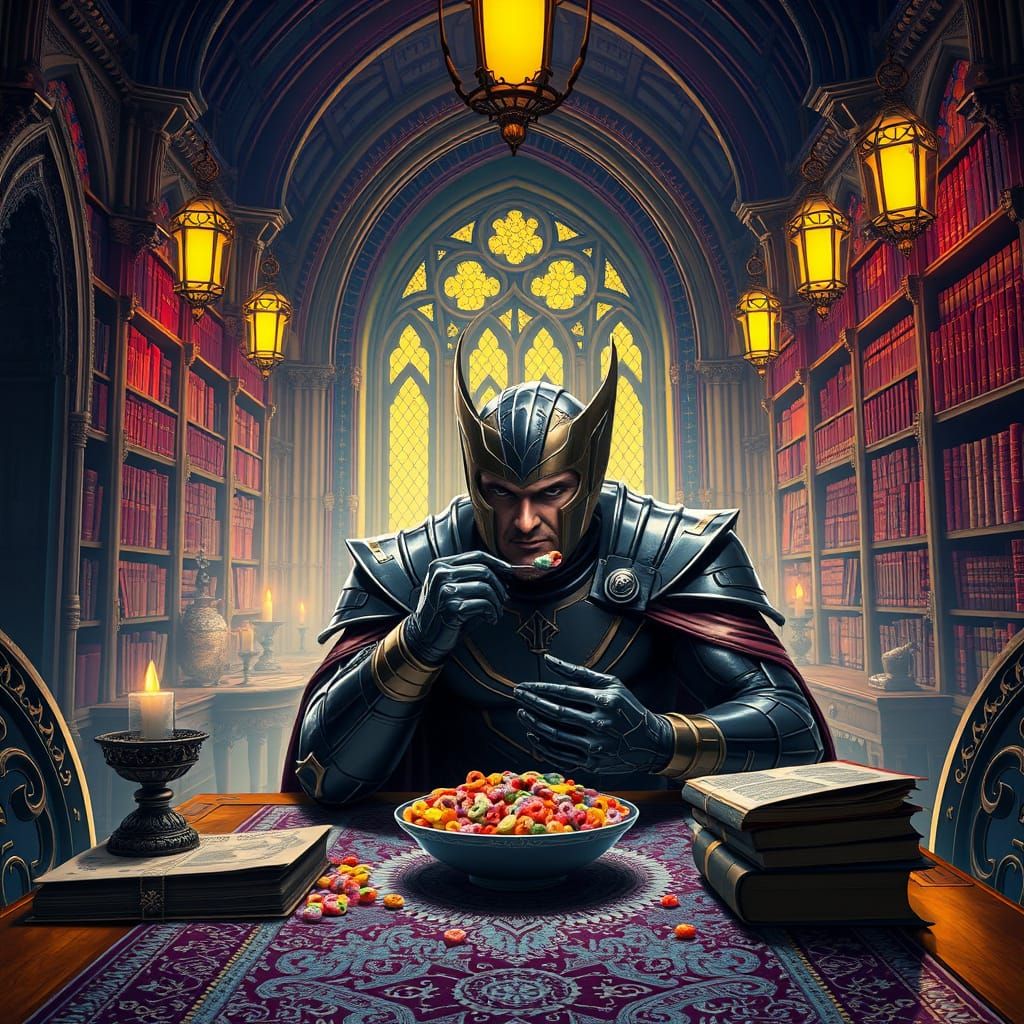 This image shows Magneto enjoying breakfast amidst ancient books and artifacts. The scene is rendered with hyperdetailed textures and architecture, dramatic flair, art nouveau elegance, and cinematic depth in rich, deep colors.