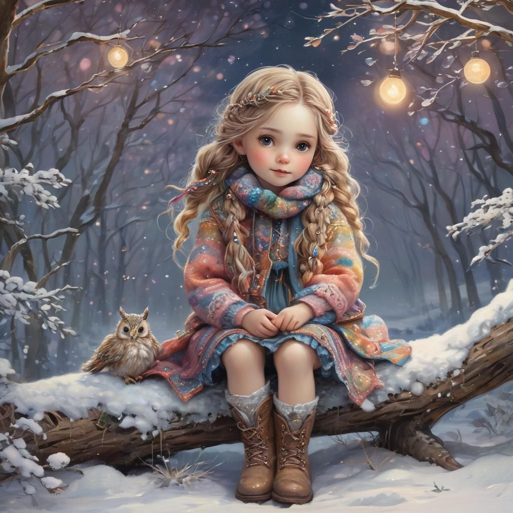 That looks so cold. Sitting in the snow. She is very pretty. Nice work. I do like the lights and the little owl.