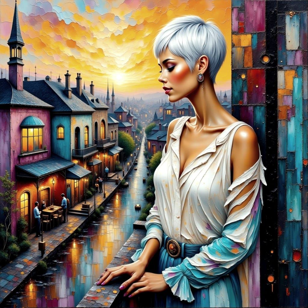 This image shows a woman with white hair on a wooden balcony, overlooking a street with a jazz band. Rendered as an impasto oil painting with fluid art elements.