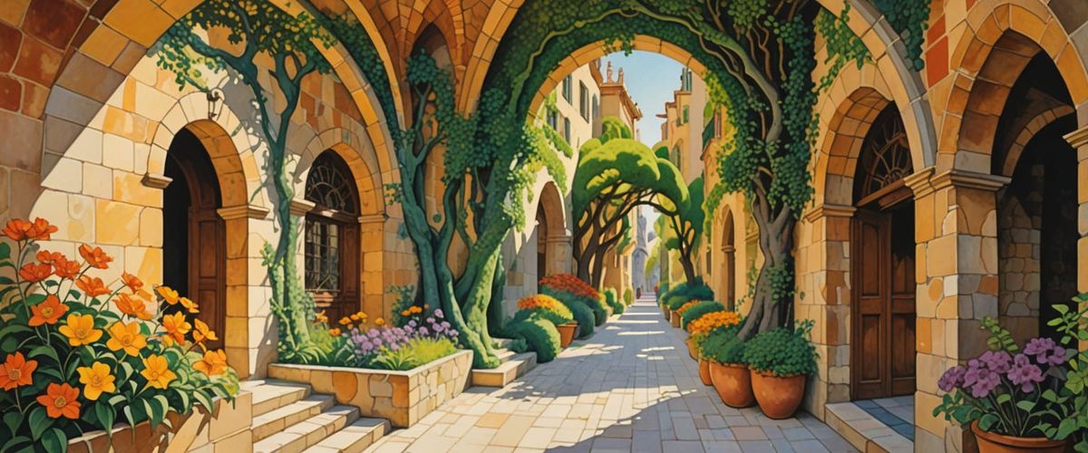 A sunlit, abandoned passageway with mossy trees and vibrant flowers growing on travertine walls. The scene features intricate arches, doorways, and volumetric lighting in watercolor and gouache style.