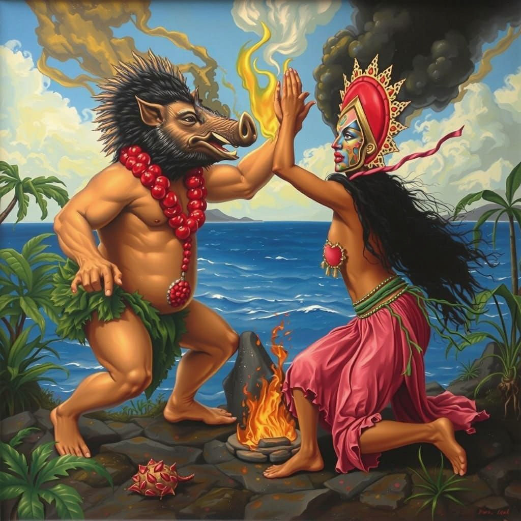 This image shows a dynamic, Gauguin-inspired scene of Kamapua'a and Pele in a fierce yet romantic battle. The goddess's fiery gaze meets the boar-man's passionate gaze, set amidst a volcanic landscape.