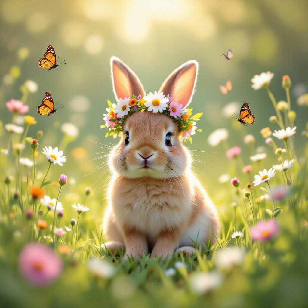 This image shows a tiny, whimsical rabbit with a flower crown in a sunlit meadow full of wildflowers and butterflies, rendered in a soft, impressionistic style.