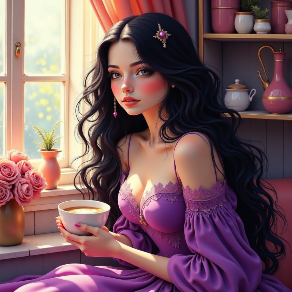 This image shows a 17-year-old girl with long, curly black hair in a violet gown, drinking cocoa in her kitchen. The image features soft morning light and art nouveau elements.