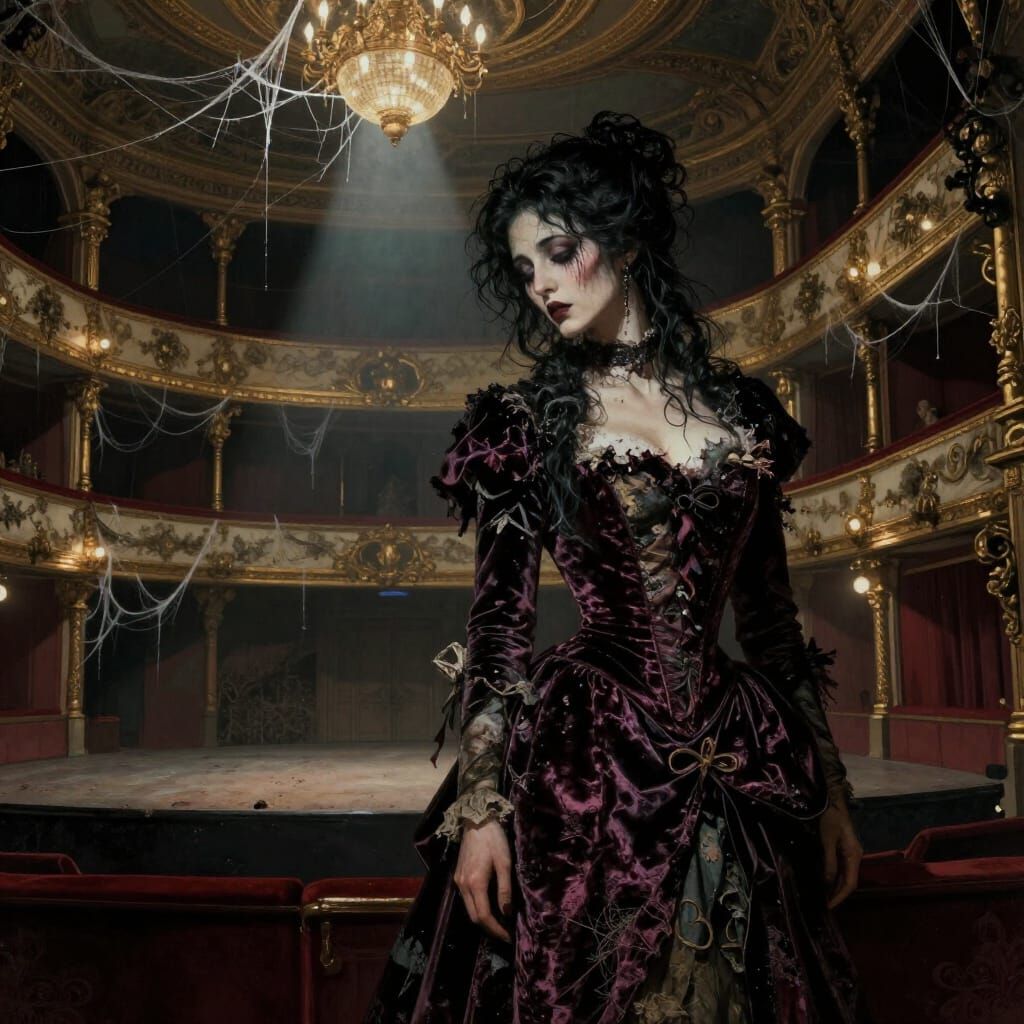 A haunting illustration of a courtesan in a dimly lit, decaying theatre. Dramatic lighting and intricate detail evoke a gothic, dark fantasy aesthetic with contrasting colors.