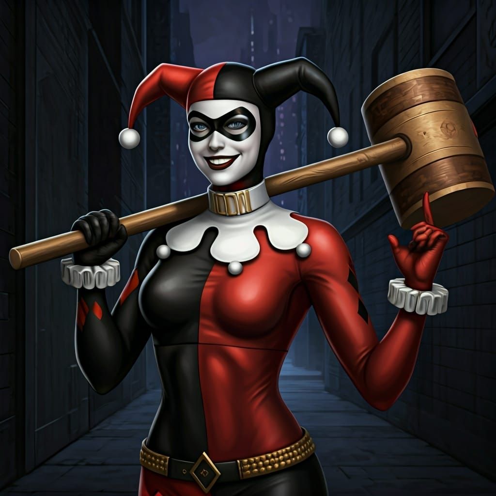A striking picture of Harley Quinn in her classic jester outfit, holding a mallet and smirking. Set in a gritty Gotham alleyway, in a comic book art style.