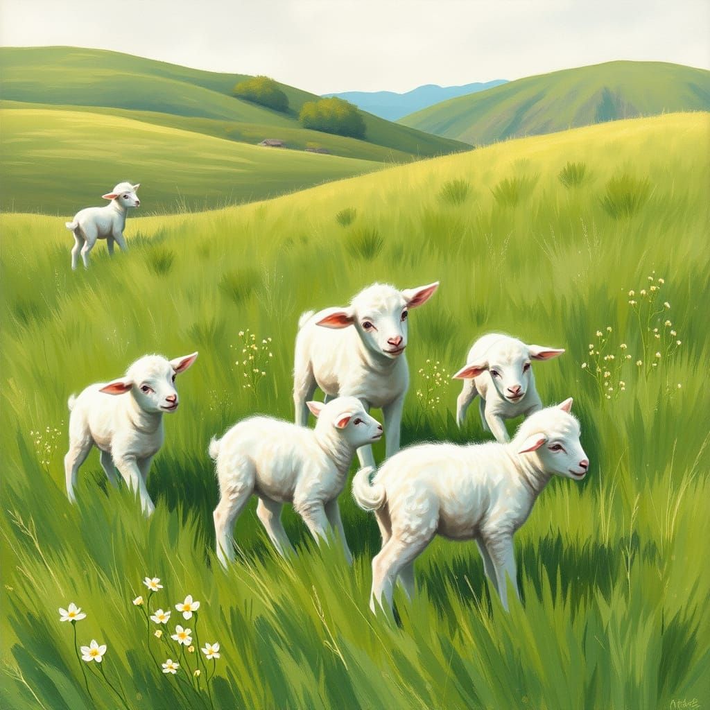 This enchanting gouache painting captures a serene spring morning scene, with fluffy lambs playing in a lush green meadow surrounded by gentle hills, blending watercolour softness with gouache texture in a dreamlike, Beatrix Potter-inspired style