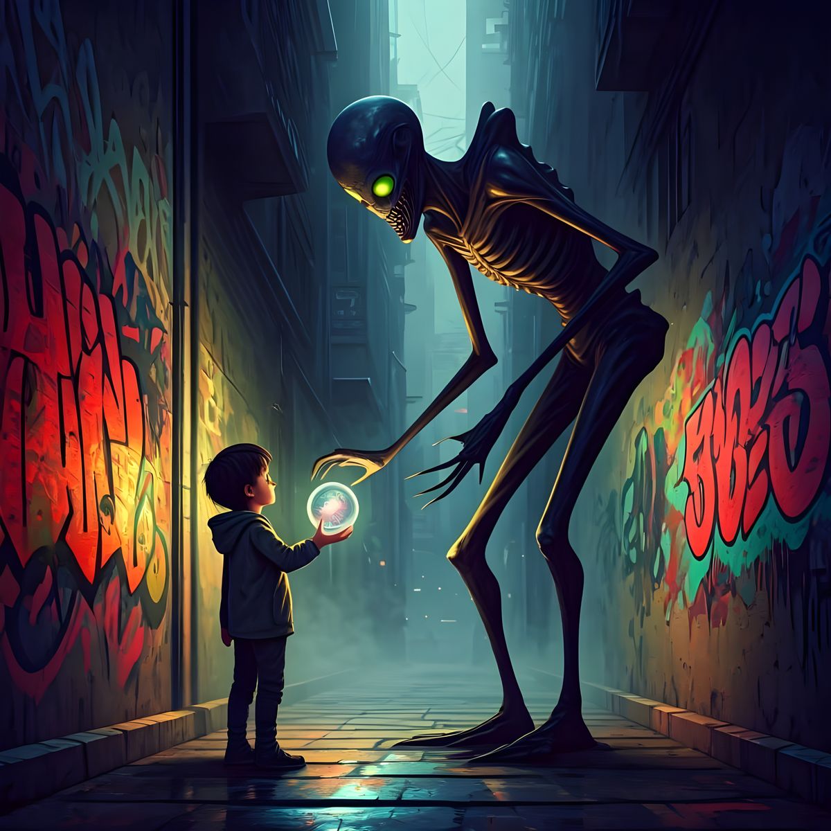 This image showcases a detailed, 3D anime-style scene of a child receiving a glass orb containing a breathtaking galaxy from a striking alien figure, blending elements of concept art and comic book styles.