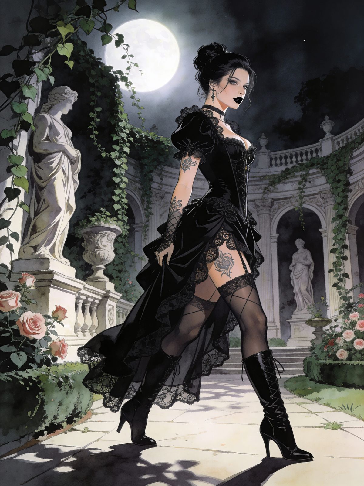 A detailed illustration of a goth woman in a black baroque dress walking through mansion gardens. Soft moonlight creates a romantic atmosphere, highlighting her tattoos and wench boots.