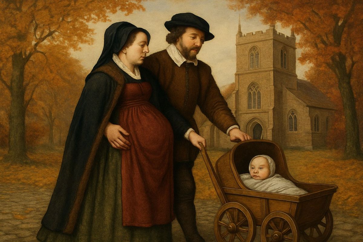 This image depicts Anne, visibly pregnant, walking with Shakespeare and their baby towards a church in Stratford. It is rendered in the style of Hans Holbein, capturing a historical, realistic aesthetic.