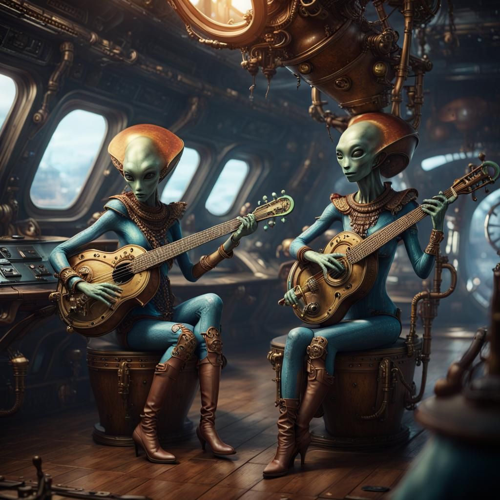 This image shows two alien spacewomen enjoying leisure time with musical instruments aboard a spaceship. The scene is rendered in a steampunk style with intricate details and deep colors.