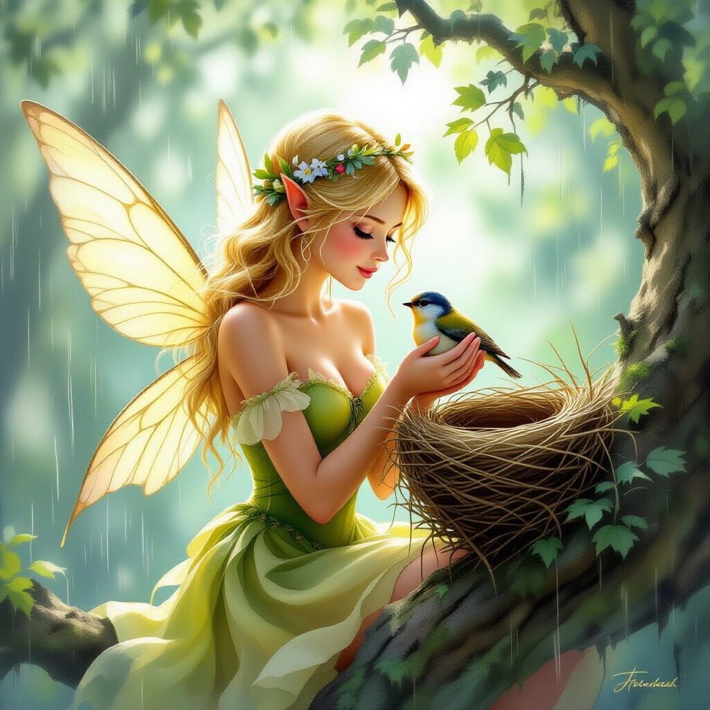 A beautiful blonde fairy in a yellow-green dress cradles a bird, placing it in its nest on an oak branch amid a soft rain. Ethereal fantasy art in wet watercolor style with a glowing ambiance.