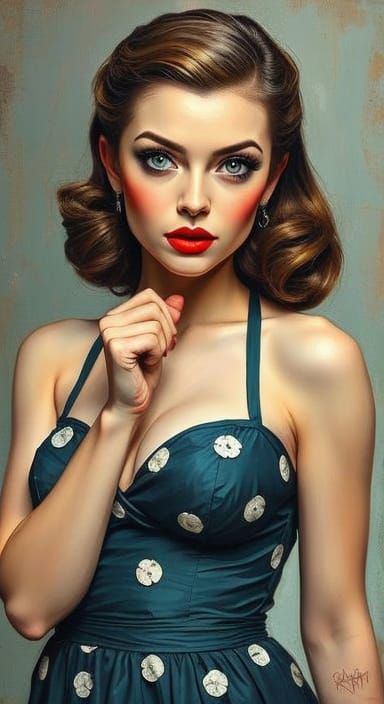 A vibrant impasto-style portrait of a pinup girl in a short dress, making direct eye contact. The artwork is characterized by thick brushstrokes and a bold color palette.