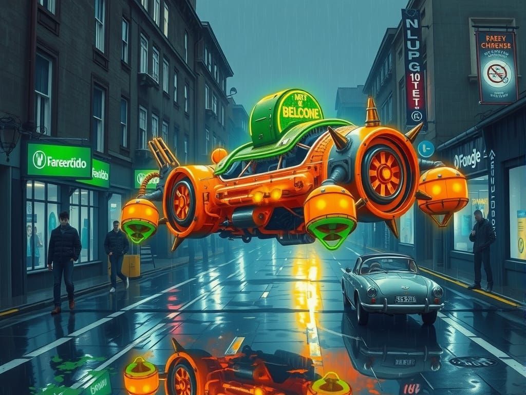 This image shows a steampunk-style spaceship with neon green and orange lights on a dark, wet street. The artwork is reminiscent of watercolour gel paint techniques.
