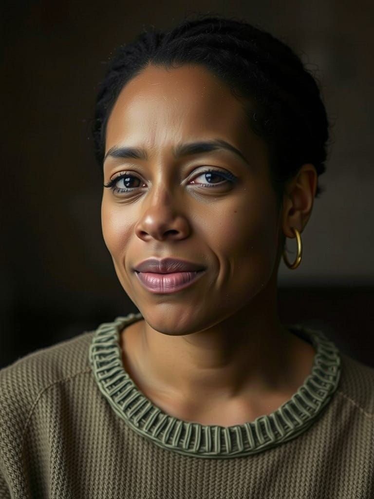 This intimate portrait captures an African American woman's emotional depth, with tears and a hopeful smile under soft, diffused light. Realistic imperfections enhance the soulful contrast.