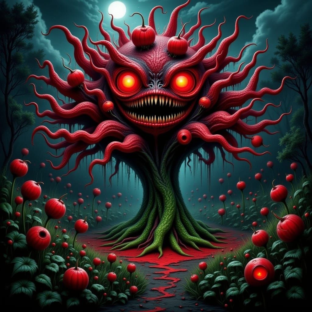 An eerie garden scene at night featuring skulls as flowers and eyeballs as blossoms. A spectral tree glows red under the full moon, surrounded by tentacle-like plants.