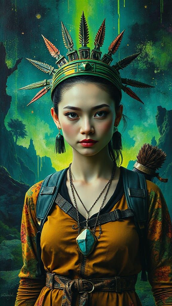 A vibrant painting of a woman in hiking gear standing before a dimensional portal. The artwork is rendered with thick impasto strokes and has a cyberpunk aesthetic.