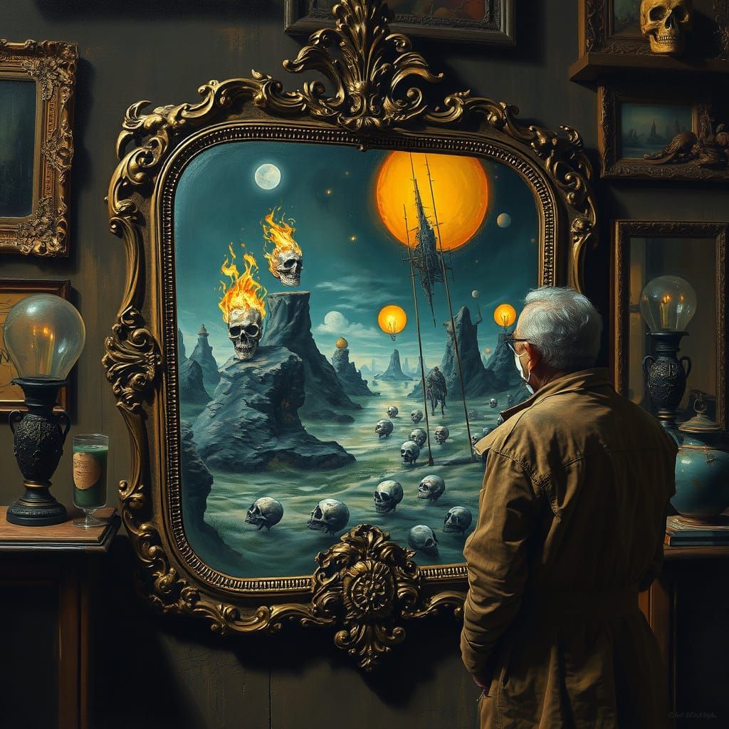 A striking picture of a person gazing into an antique mirror, which reflects a surreal, otherworldly realm. This image blends realistic and fantastical elements in an oil on canvas style with vibrant colors.