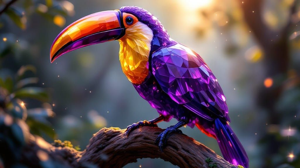 This stunning image showcases a vibrant amethyst crystal sculpture of a Toco Toucan perched on a gnarled tree branch, surrounded by a magical jungle with strong rim lighting and ethereal sparkles.