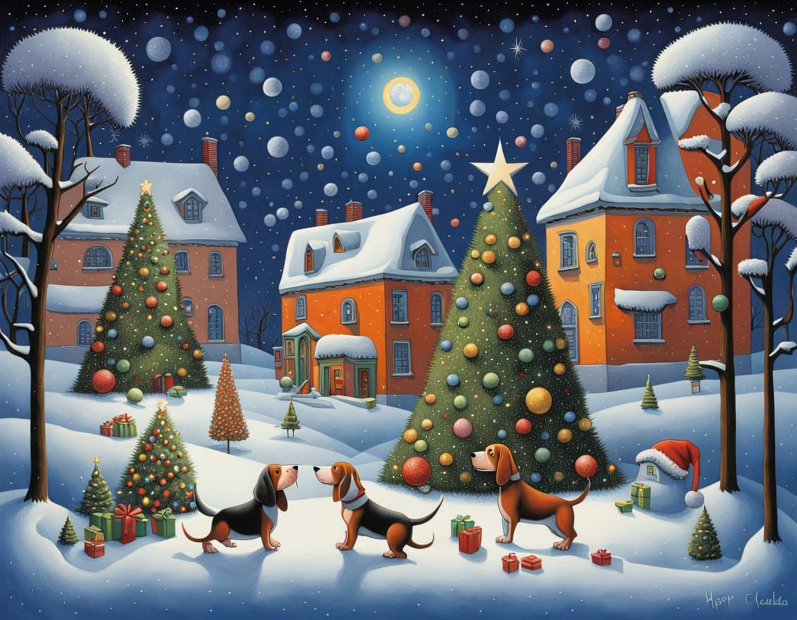 This image shows charming Basset Hounds in a festive Christmas setting, depicted with soulful eyes and floppy ears. The artwork blends cubist and watercolor styles with vibrant colors and intricate details.