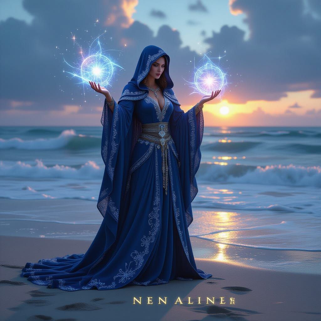 This image shows a sorceress in indigo robes on a turbulent seashore, channeling light onto ancient runes. Rendered as a hyperdetailed digital matte painting with cosmic elements and dynamic lighting.