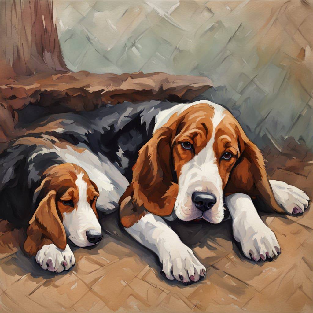 This image shows a cute Bassett Hound dog curled up comfortably at the feet of its owner, rendered in the style of an oil painting.