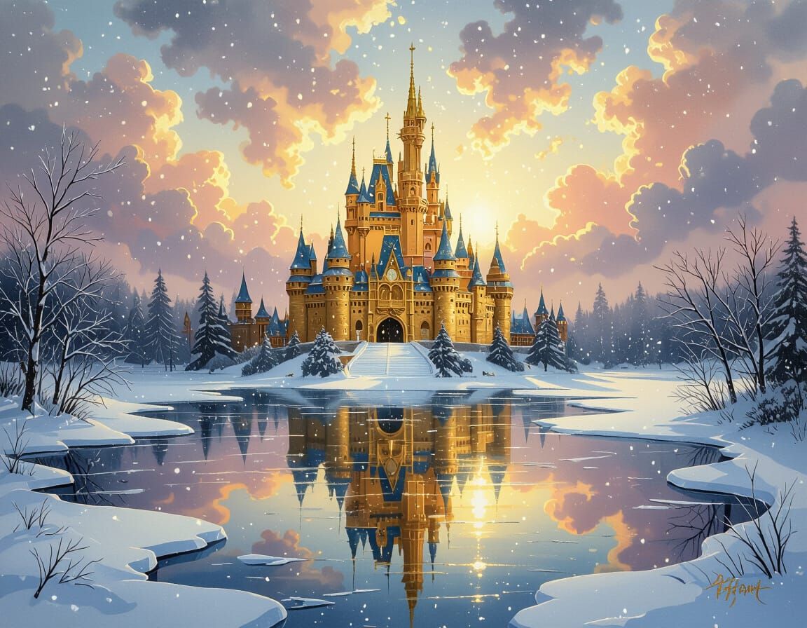 This image shows a stunning golden castle reflected in a frozen lake, surrounded by bare winter trees and gently falling snow. The sky features dramatic pink and gold clouds, rendered in a vibrant, high-contrast graffiti art style.