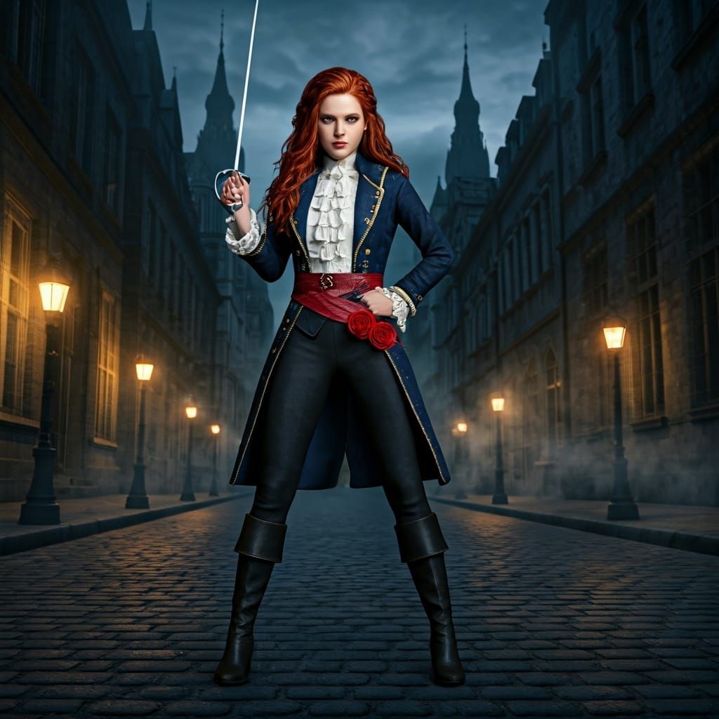 A striking picture of a confident teenage girl with red hair in a dark fantasy city. She is dressed as a duelist with a violin case, standing in a dramatic pose.