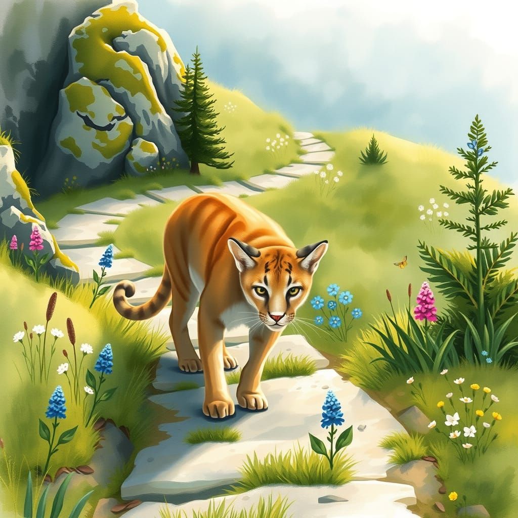 A delicate watercolor painting of a cougar wearing a coat, walking a mountain trail. Lush greenery and blooming wildflowers surround the cougar in the warm morning light.