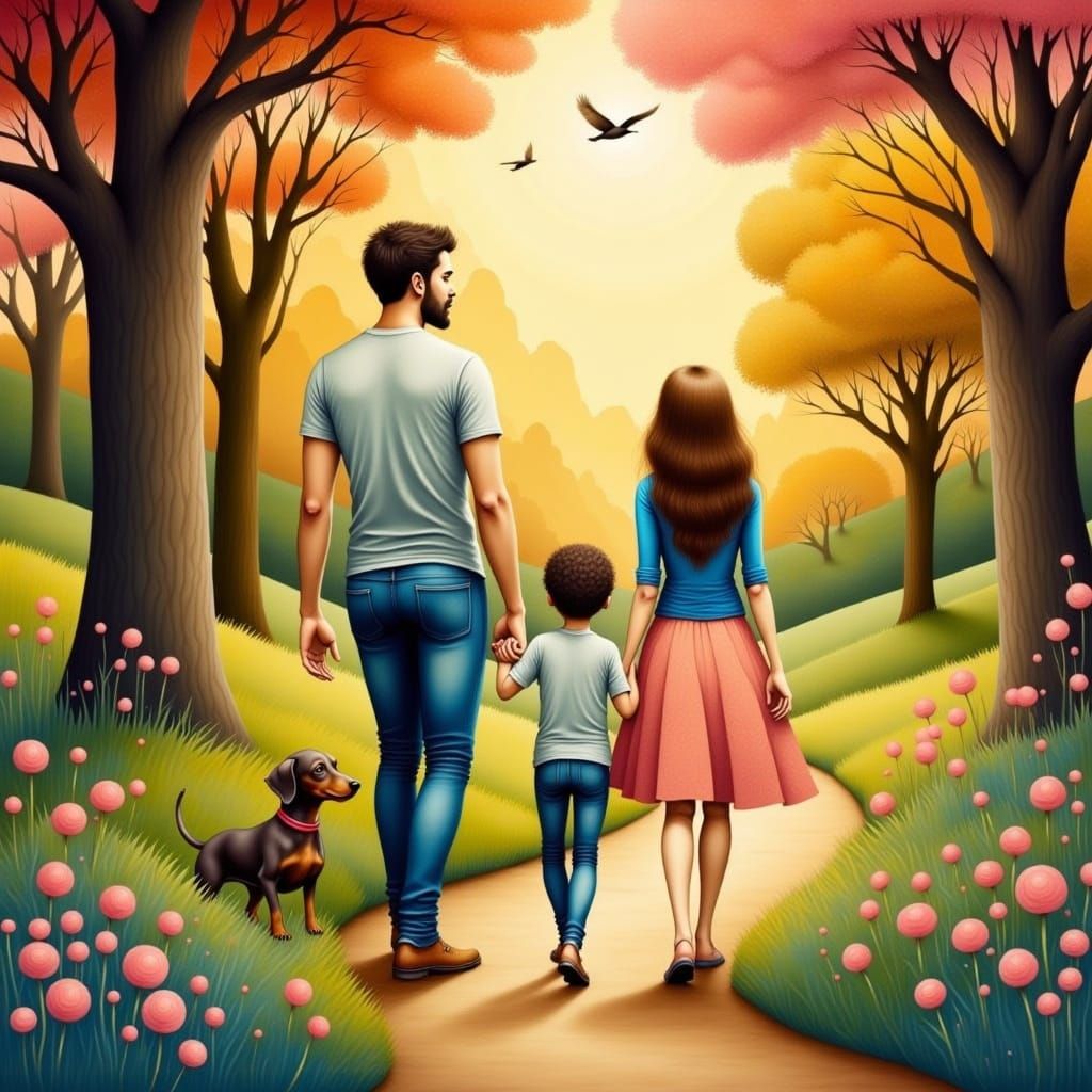 A vibrant watercolor image of a father walking in a park with his two children and their dog. The artwork evokes golden hour with dynamic lighting in a fantastical style.