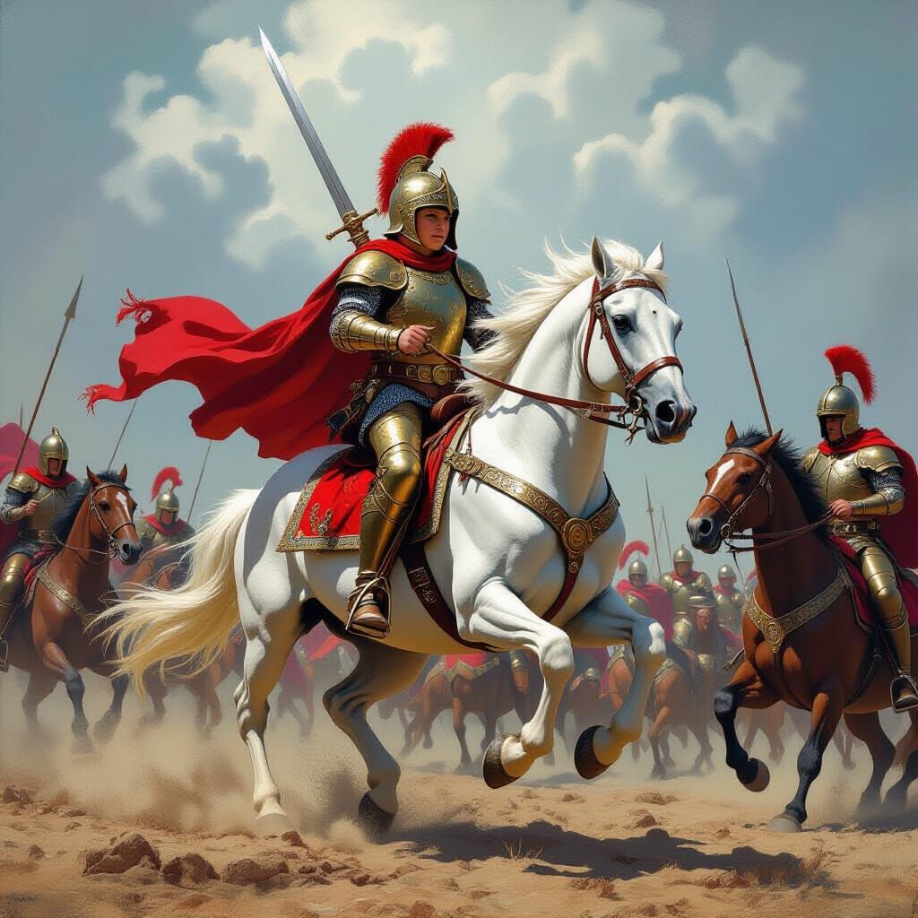 This image shows a young boy in armor riding a white horse amidst an epic battle. Dragons and knights clash in vibrant colors and dynamic textures, in a comic book art style.