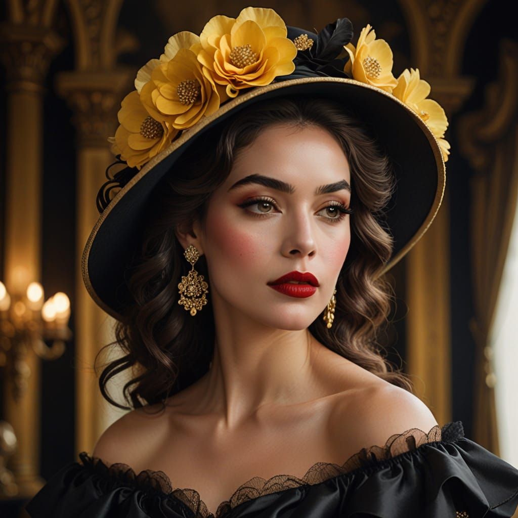 This striking portrait features a young European woman with voluminous dark curls, wearing an intricately designed yellow hat and matching off-the-shoulder dress. Soft lighting emphasizes her elegant, high-fashion look against a dark background.