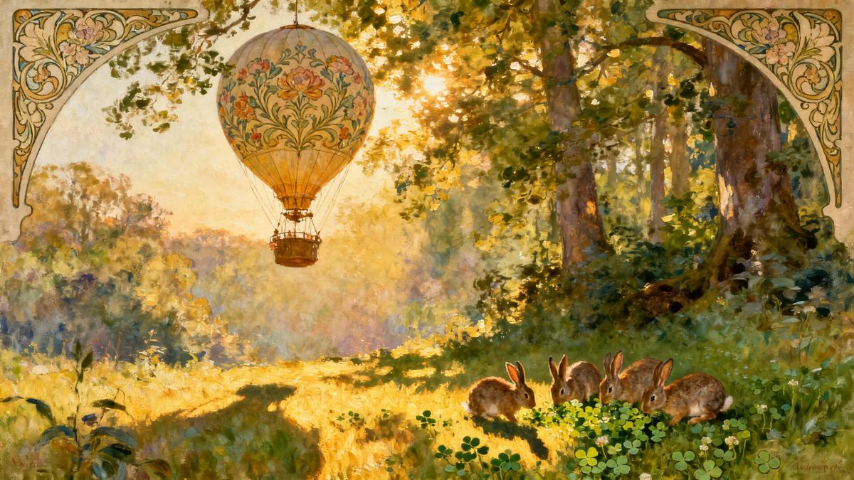 This image shows a vintage hot air balloon with Art Nouveau floral designs floating above a sunlit forest. A family of hares is visible in a clearing below, captured with soft, painterly Impressionist strokes.