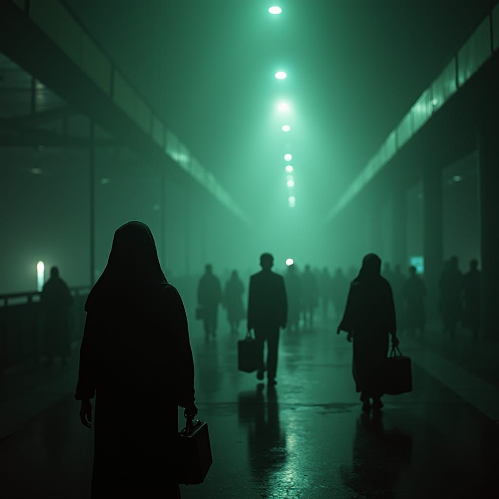 A cinematic image contrasting an international passport marked with a red cross with a silhouetted Malay Muslim couple gazing towards a bright path. The shot features a warm color palette and film grain texture.