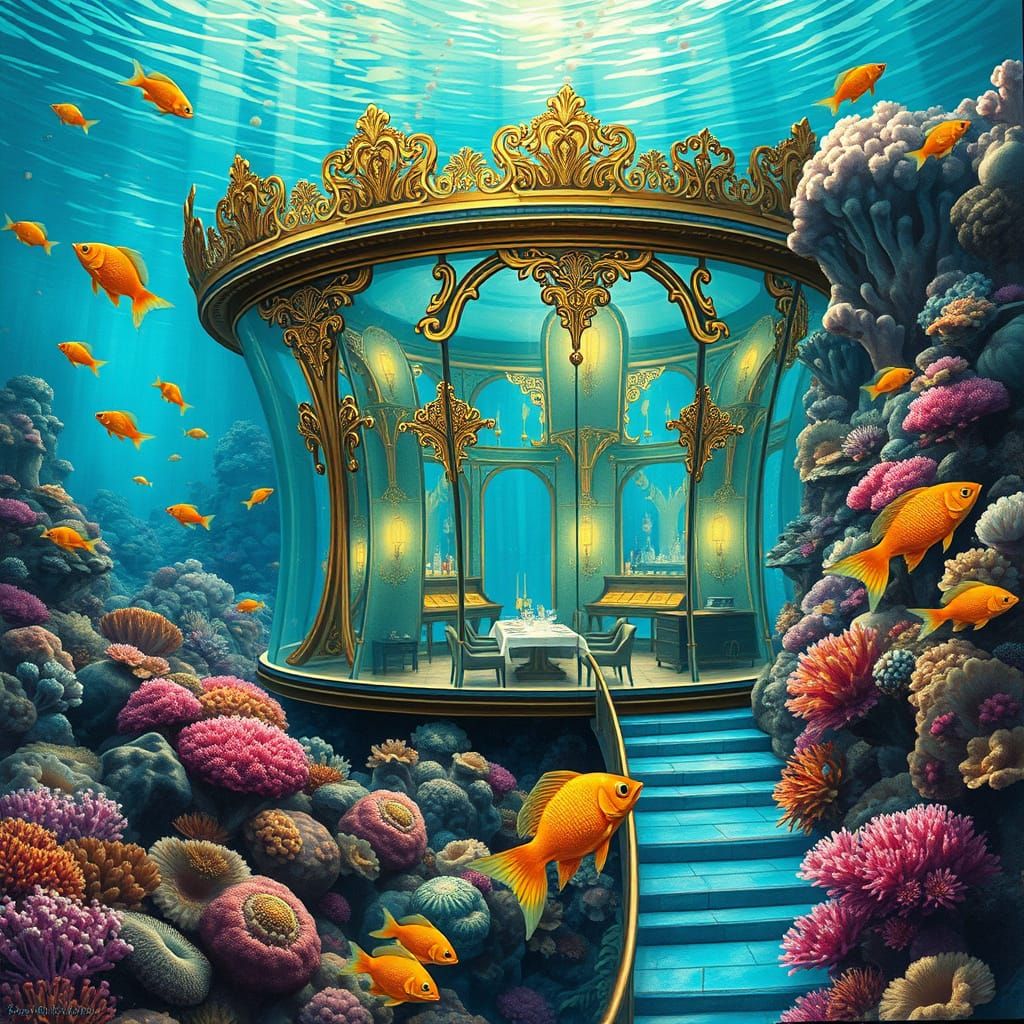 A hyperrealistic underwater glass restaurant with gold detailing, teeming with marine life. This image captures a blend of modern fantasy and futuristic design, featuring warm lighting and soft shadows in rich jewel tones.